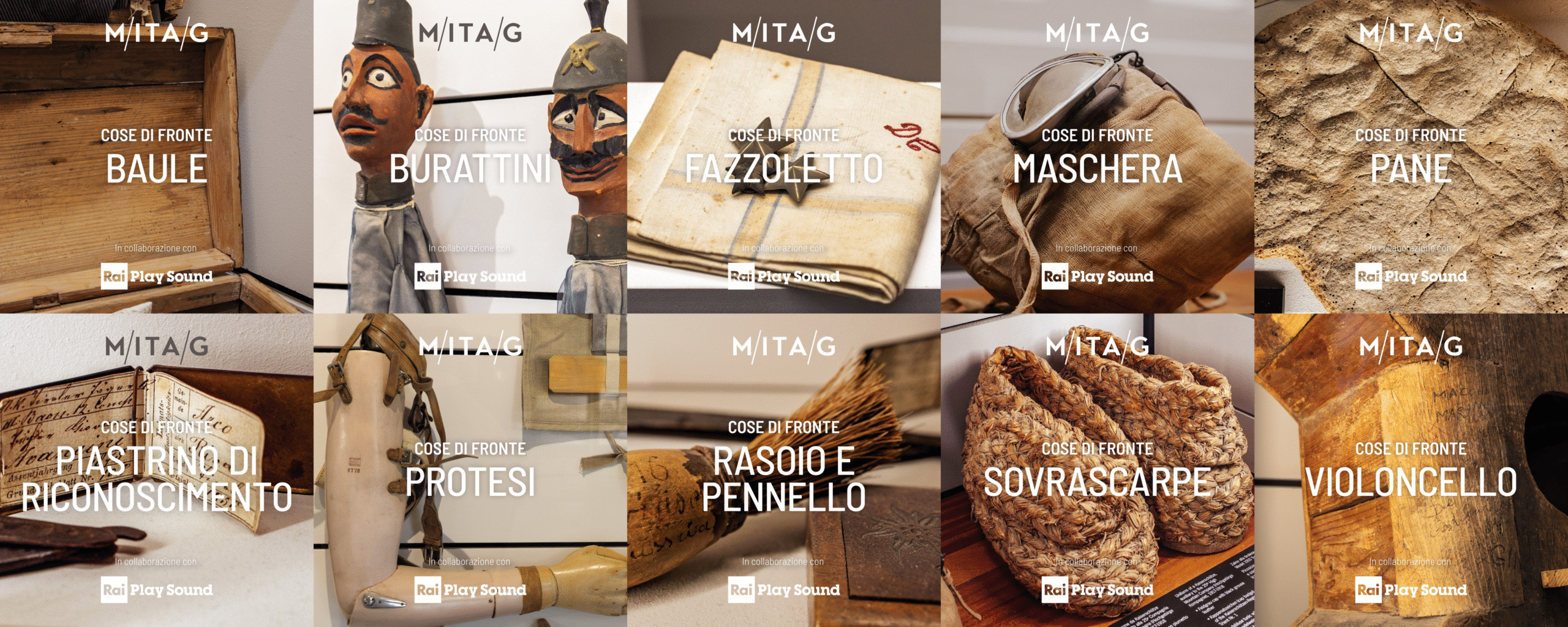 Un baule, un violoncello, un pezzo di pane, una protesi, una maschera antigas, un set da barba, un piastrino di riconoscimento, un fazzoletto, delle sovrascarpe, due burattini. Dieci oggetti per un intreccio di storie che corrono tra la Prima guerra mondiale e il presente. In ogni episodio si possono trovare racconti, interviste, paesaggi sonori e voci di oggi che ci parlano di vicende contemporanee e culture diverse, moltiplicando i punti di vista nel racconto della guerra.